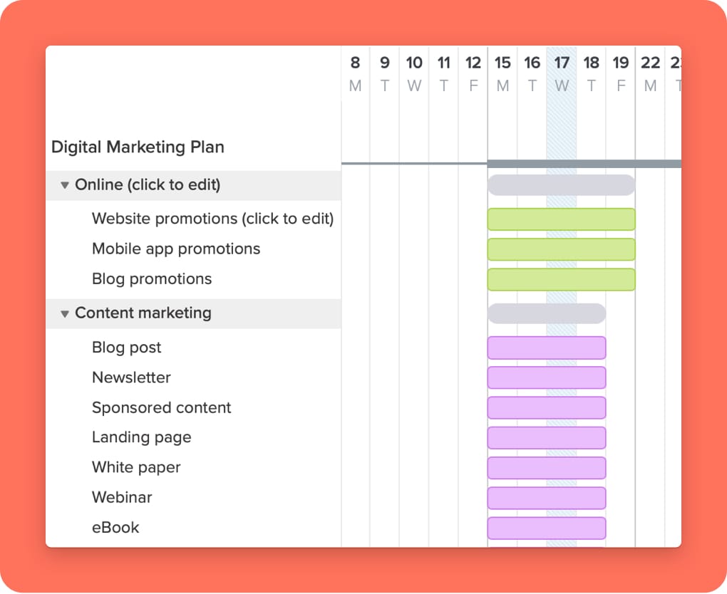 We believe a solid plan is the backbone of any successful project. Every team and business benefits from having a simple online gantt chart that’s easily accessible and flexible. Here are a few examples: